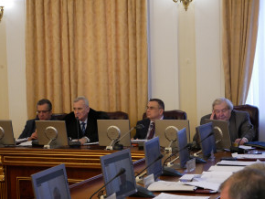 На фото в центрі Президент НАН України академік А. Загородній, ліворуч – Перший віцепрезидент НАН України академік В. Богданов і Віцепрезидент НАН України академік В. Горбулін, праворуч – Перший заступник головного ученого секретаря – начальник Науково-організаційного відділу О. Кубальський і Віцепрезидент НАН України академік В. Радченко